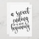 Una elegante señaligen de boda de vanguardia, con el texto "Un final dulce para un nuevo comienzo" en una fuente de letra extrovertida, la textura de pincel añade un sentimiento espontáneo y juguetón. El color de fondo se puede personalizar según tus necesidades y preferencias, por favor contactame si tienes alguna solicitud especial.