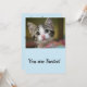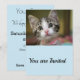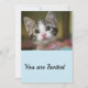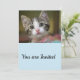 Una invitación, estilo plano con un gatito atigrado con ojos verdes, con un fondo borroso