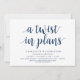 Tarjeta de cambio de fecha. Esta es la invitación de la fiesta de boda reprogramada (pospuesta / aplazamiento) (Un giro en los planes), en tema de diseño minimalista moderno y simple, fuente Azul Marino.
