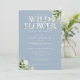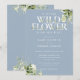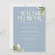 Una invitación de baby shower de una pequeña flor silvestre con tipografía azul polvorienta elegante y hermoso follaje de vegetación botánica. Diseñado por Thisisnotme©