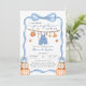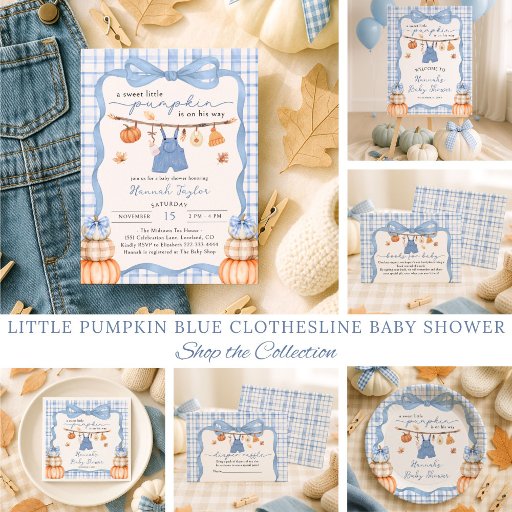 Celebra la próxima llegada de un niño pequeño con esta encantadora invitación a la ducha de calabaza. Con un fondo de manto azul dulce, calabazas acuarelas y un adorable diseño de ropa de bebé, esta ducha con temática de otoño es perfecta para una celebración de otoño. El elegante tipo de letra del guión, combinado con detalles rústicos, lo convierte en el lugar ideal para honrar el estilo de una futura madre. Personalice esta plantilla de ducha de bebé editable con el nombre de la futura madre, la fecha del evento, la hora, la ubicación y los detalles del RSVP. El diseño es totalmente personalizable, lo que le permite ajustar los tipos de letra y la redacción para que se adapte a su temática de ducha única. Ya sea que esté organizando una acogedora reunión de otoño, una ducha de bebé con tema de calabaza o un fiesta de té de temporada, esta invitación marca el tono perfecto. Es una forma digna de seguir invitando a amigos y familiares a que se inunden con amor la nueva llegada.