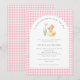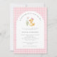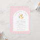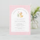 Un pequeño Duckling está en la invitación de Baby Shower Way Duck - con un pequeño pato sentado al lado de flores rosas y con un arco de coqueta rosa. La invitación está rodeada de un adorable gingham rosa con una tipografía moderna que le da un toque minimalista. La invitación forma parte de una colección de Baby Shower.
