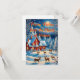 Esta original tarjeta de Navidades cuenta con un encantador paisaje invernal lleno de divertidos copos de nieve bailando en el aire. En el centro se encuentra una casita de campo acogedora y bien decorada, con luces intermitentes y tejado de nevadas. Alrededor de la cabaña hay criaturas alegres de bosques, una familia de cordiales venados de los árboles. El cielo es un azul intenso, salpicado de estrellas y una luna llena que arroja un resplandor mágico. Los adornos festivos y los dulces enmarcan los bordes, añadiendo un toque de alegría para las vacaciones. Dentro, un mensaje sincero dice: "¡Deseándote una Feliz Navidad llena de alegría, risas y momentos mágicos!"