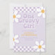 Invitación de cumpleaños número uno inspirada en One Groovy Girl con fuentes de estilo de los 70 y patrón de margaritas y cuadros.