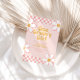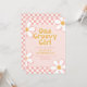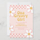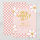 Una invitación de cumpleaños inspirada en One Groovy Girl Retro con fuentes de estilo de los 70 y margaritas y patrón de cuadros.