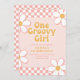 Invitación de cumpleaños número uno inspirada en One Groovy Girl Retro con fuentes y margaritas de estilo de los 70 y patrón de cuadros.