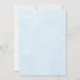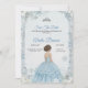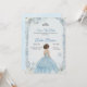 Tarjeta de invitación con una niña en un vestido de baile azul con un borde floral y de copos de nieve. El texto detalla una celebración. La parte trasera es de un azul claro liso.