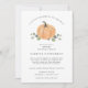 este diseño incluye una calabaza acuática sobre una cama de hojas de eucalipto y el texto sobre la superficie. Hay una calabaza en camino. Esta es una gran invitación elegante para tus invitaciones a la ducha de bebé.