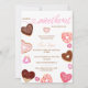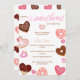 Una pequeña novia está en camino, una valentina amorosa se desliza con una ducha de bebé adorable con adorable ilustracion original de donuts en forma de corazón con un patrón de postre color rosa y chocolate con una tipografía de escritura con un cepillo de letras en forma de corazón.
