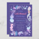 Invitación de cumpleaños de bebé niña de sirena debajo del mar con acuarela morada. Diseño femenino que puedes personalizar con tu nombre y texto para una fiesta de bebé niña.