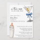 Una Tini está en camino Invitación de baby shower Martini Azul para niño con foto - Una simple invitación de baby shower de estilo acuarela para un bebé niño. Con caligrafía y fuente de bloque elegante. Una ilustración de acuarela de un martini sucio con dos aceitunas y un lazo azul coqueto adorna la esquina superior derecha, mientras que una ilustración de acuarela de un biberón adorna la esquina inferior derecha. Edite esta plantilla de invitación de baby shower con los detalles de su evento. Todo el texto es editable. Personalice aún más esta invitación de baby shower agregando una foto de la futura mamá en el reverso de la invitación. También disponible como descarga digital instantánea, una forma ecológica de enviar invitaciones por mensaje de texto, correo electrónico o redes sociales.