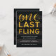 Esta moderna y luminosa invitación a la soltería incluye purpurina de oro falso, caligrafía de bonito y rayas negras y grises de moda.