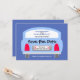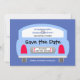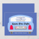 Si está buscando una invitación única para guardar la fecha, ésta es. La invitación muestra la parte posterior de un auto azul sobre un fondo azul más oscuro con las palabras "Save the Date" (Guardar la fecha) a lo largo de la parte posterior del auto. Puede poner sus nombres dentro del parabrisas trasero y personalizar la placa de matrícula con la ubicación y la fecha de su boda. Copyright henishouseofpaper