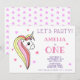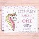 Un lindo unicornio de color Bonito con estrellas Invitación de primer cumpleaños para un chica // Invitar a los amigos y familiares de su hijo con esta adorable invitación de cumpleaños con temática de unicornio. El diseño incluye un unicornio con una hermosa manga y estrellas rosas. Esta invitación a la fiesta de cumpleaños es genial para el primer cumpleaños de un chica. Fácil personalizar todos los detalles con los suyos.