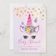 Una invitación a la ducha para bebés con un moderno ilustracion rosa de unicornio con un cabecero de flores y mariposas extravagantes volando por ahí. Confeti de oro falso roció por la parte superior. Un fondo de color morado pálido y amarillo acuático.