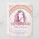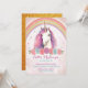 Una invitación adorable con un unicornio en el centro con un cuerno colorido, pelo ondulado, rosas y un arco iris purpurinoso en la parte trasera. Muy lindo y bonito. Los colores son rosa, azul, violeta, dorado y verde. ¡Muy divertido para una fiesta de cumpleaños con temática de unicornio!