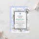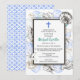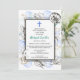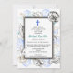 Una colección de conchas marinas rodea un simple marco doble en esta invitación de bautismo. Una cruz azul acentúa la parte superior. La parte posterior tiene un patrón de mar para completar el tema.