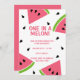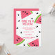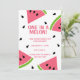 Una en una invitación de fiesta de cumpleaños de Melon, aunque el texto puede ser cambiado para cualquier año de cumpleaños o ducha de bebé. Imagen de sandía verde y rosa brillante con adornos de semilla de sandía.