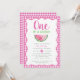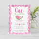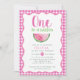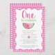 Una en una Melón Melónica Invitación de primer cumpleaños - ¡Ella es una en un melón! 🍉 🌸 Celebrar el primer cumpleaños de tu dulce niña con esta adorable invitación de niñita que está llena de encanto! Con sus alegres tonos rosa, su moderna tipografía lúdica y sus ilustraciones más jugosos, este diseño es tan fresco y divertido como el de su pequeña. Un delgado fondo de gingham rosa añade una rúbrica de dulzura y encanto sureño, perfecto para una celebración de verano llena de gafas, tartas y sol. ¡Es la forma más bonita de reunir a amigos y familiares para un día que es uno en un melón! 💕 ✨