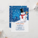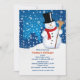 Un muñeco de nieve sonriente con un nevoso, fondo del paisaje urbano le invita a una celebración del invierno. ¡Únase a la diversión! Perfeccione para las celebraciones de días festivos, las fiestas de cumpleaños y más.