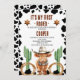 Invitación de primer cumpleaños de Cowboy Highland Cow My First Rodeo Invitation Cute de pequeño vaquero con tema de primer cumpleaños que incluye una vaca de la sierra usando un gorra de vaquero, insignias de serif, cuerda, cactus y patrón de impresión de vaca negra. Idea para la fiesta de cumpleaños de rodeo de primer cumpleaños de un niño, pero puede ser usada para cualquier edad.