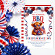 La mejor vaca de las tierras altas con un par de gafas de sol y ondeando una bandera bajo un arco de globo patriótico en rojo, blanco y azul es la base de esta celebración "BBQ" del "4 de julio".