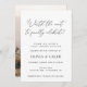 Invitación de recepción de boda con "vale la pena esperar para finalmente celebrar" en una elegante letra cursiva negra. Personalice con su foto en el reverso o elimine si no se desea ninguna foto.