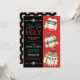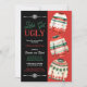 La invitación del Sweater Party "Let's Get Ugly" (Pongámonos fea) Navidades incluye un trío de desagradables Navidades sudaderos delante sobre un atrevido fondo rojo en el lado derecho. El lado izquierdo muestra los detalles de tu celebración en rojo, blanco y verde verde azulado con gráficos de separación de copos de nieve en la parte superior e inferior, todo sobre un fondo negro audaz. La parte trasera muestra una repetición del patrón de los desagradables suéteres de las vacaciones y de las bayas y las bayas sobre un fondo negro. Los suéteres tienen una variedad de diseños festivos y peculiares, que captan el espíritu divertido y excéntrico de la temporada de vacaciones. La leyenda de la invitación, "Let's Get Ugly", se muestra de forma destacada en la parte delantera con un par de fuentes llamativas. ¡Este divertido diseño retro es seguro que complacerá a sus destinatarios! Diseño compuesto por Holiday Hearts Designs.