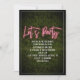 Inspiración de neón rosa con el texto "Vamos a la fiesta" sobre fondo de vegetación de boj con texto blanco personalizado.