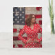 La imagen muestra a una mujer segura de sí misma de pie, con aspecto de Kamala Harris frente a una gran bandera estadounidense. Está vestida con una llamativa chispa roja de puntos polka, que le da un toque vibrante y elegante a su apariencia. Sus manos están puestas en sus caderas, y ella mira hacia un lado con una expresión compuesta y determinada. La bandera en el fondo, con sus estrellas y rayas, ofrece un telón de fondo patriótico, enfatizando temas de orgullo y liderazgo nacional. La composición general de la imagen transmite fuerza, confianza y sentido de propósito.
