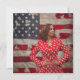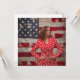La imagen muestra a una mujer segura de sí misma de pie, con aspecto de Kamala Harris frente a una gran bandera estadounidense. Está vestida con una llamativa chispa roja de puntos polka, que le da un toque vibrante y elegante a su apariencia. Sus manos están puestas en sus caderas, y ella mira hacia un lado con una expresión compuesta y determinada. La bandera en el fondo, con sus estrellas y rayas, ofrece un telón de fondo patriótico, enfatizando temas de orgullo y liderazgo nacional. La composición general de la imagen transmite fuerza, confianza y sentido de propósito.