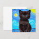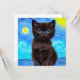 Tarjeta con un gato negro en la pintura Starry Night de Van Gogh! Este gatito de ojos azules mira adorablemente desde un fondo de remolinos azules y una brillante luna amarilla. ¡Un regalo fantástico para los amantes del gato y para los coleccionistas holandeses de arte!