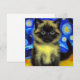 Tarjeta con un gato siamés en la pintura Starry Night de Van Gogh. Esta belleza esponjosa posa frente a un cielo azul nocturno con luna brillante y estrellas. ¡Un regalo acogedor para los amantes del gato y de los coleccionistas holandeses de arte!