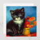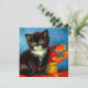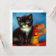 Tarjeta con un hermoso gato Van Gogh tuxedo! Este pequeño gatito se encuentra junto a una cesta de flores naranjas sobre una mesa roja. ¡Un gran regalo para los amantes del gato y para los coleccionistas holandeses de arte!
