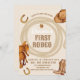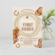 Los temas del primer cumpleaños de Rodeo invitan a los niños a cumplir los cumpleaños. Esta invitación puede ayudarle a hacer una fiesta de cumpleaños memorable. Elegante caligrafía sobre fondo de lazo rodeada de accesorios de vaquero: gorra, herradura, montura, placa del sheriff y botas con espuma.