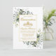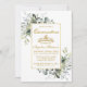 Moderna y elegante acuarela La tarjeta de invitación Quinceañera Boda de Verdor Botánico incluye hojas de eucalipto, follaje botánico verde, hojas azul polvorientas y otros hermosos paisajes botánicos. Marco dorado. Sage Green Back.