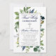 Elegante color de agua vegetación botánica Primera invitación a la comunión sagrada incluye acentos azules. Marco plateado. Cruz de Plata. Foto de vuelta.