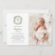 Esta sencilla y minimalista invitación al bautismo o a la cristiandad incluye una elegante cortina de agua llena de vegetación y follaje rústicos, con una falsa cruz de oro y sutiles manchas de color verde en el centro, sobre un fondo blanco. La foto de su bebé también aparece.