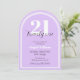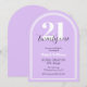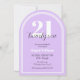 La invitación de cumpleaños número 21 "Twenty One Purple Black Arch Chic" presenta un fondo morado con un elemento de forma de arco multilíneas blanco, lo que agrega un toque moderno y trendy. El gran número blanco "21" está elegantemente superpuesto con el texto negro "twenty one", mientras que el nombre personalizado en fuente blanca completa el diseño elegante. La tipografía negra mantiene el aspecto minimalista pero audaz, lo que la convierte en una opción perfecta para una celebración importante.