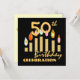 Estas velas de oro son una manera festiva de invitar a la gente a una celebración de 50 años. Todo el texto es totalmente personalizable. Añade tu año de cumpleaños y detalles del fiesta! Puede experimentar con diferentes tipos de papel haciendo clic en la pestaña "Opciones de invitación" en la esquina superior derecha. Esta invitación se encuentra actualmente en un papel básico, pero recomiendo ya sea el matiz de hielo o el papel metálico en tonos dorados que le darán a tu invitación de cumpleaños un brillo festivo. Para más tarjetas de cumpleaños número 50 y sellos, haz clic en las miniaturas de abajo.