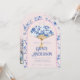 Esta invitación a la fiesta del té tiene un diseño de estilo chinoiserie con un ventilador azul y blanco sobre fondo rosa. El borde arqueado tiene un patrón de rama floral azul sobre un fondo rosa rubor. La parte trasera tiene una gran pagoda.