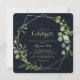 Esta geométrica verde dorado celebremos la invitación a la fiesta es perfecta para una simple fiesta de compromiso, una fiesta de soltera, una jubilación, graduación, boda tras fiesta o cualquier evento o fiesta. El diseño está decorado con hermosas hojas verdes pintadas a mano en un fondo azul oscuro, adornando un marco geométrico dorado.
