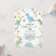 Invitación al primer cumpleaños con la temática de los dinosaurios Blue Green One Dino Mite Dinosaur con seis dinosaurios, globos amarillos, sol, follaje y árboles. Esta invitación de cumpleaños de un dino mite puede ser usada para varias edades ya que todo el texto es editable.