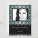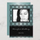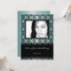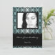 Anuncios de graduación de fondo azul verde azulado con damasco negro superpuesto. Anuncios de graduación de diseño de damasco negro y verde azulado con marco de fotografía negro y zona delantera negra para el nombre del graduado y el año escolar.