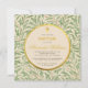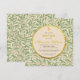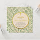 Esta elegante invitación de bautizo botánica y género neutral tiene un patrón de hojas de sauce verdes en el fondo y en la parte posterior. El texto está en un círculo que tiene el color de papel antiguo y bordes de lámina dorada falsa. Hay una cruz dorada (falsa) encima del texto. El nombre está escrito en una elegante letra caligráfica dorada, el resto en mayúsculas; la ocasión también está escrita en letras doradas, el resto del texto en negro.