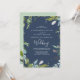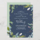 Esta tarjeta de invitación de boda de verano con vegetación y azul marino es perfecta para una boda elegante de mediados de verano. El diseño botánico presenta un exuberante arreglo de eucalipto pintado a la acuarela, vegetación y hojas verdes con delicados tallos de flores rosadas sobre un fondo azul marino.