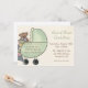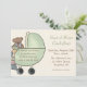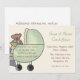 Invitación no sexista de la fiesta de bienvenida al bebé con el carro de bebé lindo del verde del oso de peluche en fondo del moreno. Las invitaciones son fáciles de modificar para requisitos particulares y de venir completo con los sobres y su opción del papel.