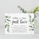 Tarjeta de invitación temática moderna rústica con verde eucalipto y guión negro (con título de tarjeta: Nada elegante, solo amor). Es perfecta para su recepción de boda después de la huida / fiesta de celebración post-boda. Agregue sus detalles en fuente / letra negra coincidente.