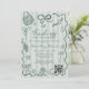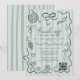 Este Diseño de Boda Caprichoso y Verde de Cítricos Fresh Off the Market (Fresco del Mercado) trae un sentimiento ligero y juguetón inspirado en los mercados de agricultores y los bocetos de productos dibujados a mano. Las líneas orgánicas, las ilustraciones de cestas, las hierbas y los motivos de vegetales crean un ambiente dulce y campestre que se siente moderno y relajado. Las franjas verdes suaves establecen un fondo cálido, mientras que el marco verde de garabatos guía la vista hacia los detalles del evento. El espacio opcional para el código QR ayuda a los invitados a acceder a la información rápidamente. Todos los colores son totalmente editables para que coincidan con tu tema.