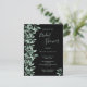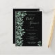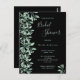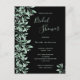Una moderna invitación a la ducha de novias en negro y verde. Un fondo negro de moda en el frente. Decorado con estribos botánicos verdes y vegetación. Guión moderno de gran tamaño con letras a mano, tipografía con el texto: Bridal Shower. Plantillas para el nombre de la novia y detalles del fiesta. Texto verde claro. Fondo negro.
